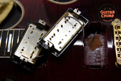 As seen in the video is a 2002 Gibson Les Paul Custom in Wine Red with a non-original Gibson case. This guitar is in good condition, and in perfect working order. There are some scratches, dings, wear on the back and tarnish to the gold hardware. Overall, I would rate the condition a solid 7.5 out of 10. Everything on the guitar is original. There are no cracks, repairs, or issues. The neck is straight with no issues and plays great. The original frets are in excellent condition. There is no buzzing or dead spots. The Gibson case works great and is in very good condition. Watch the included video to see live video of the condition.